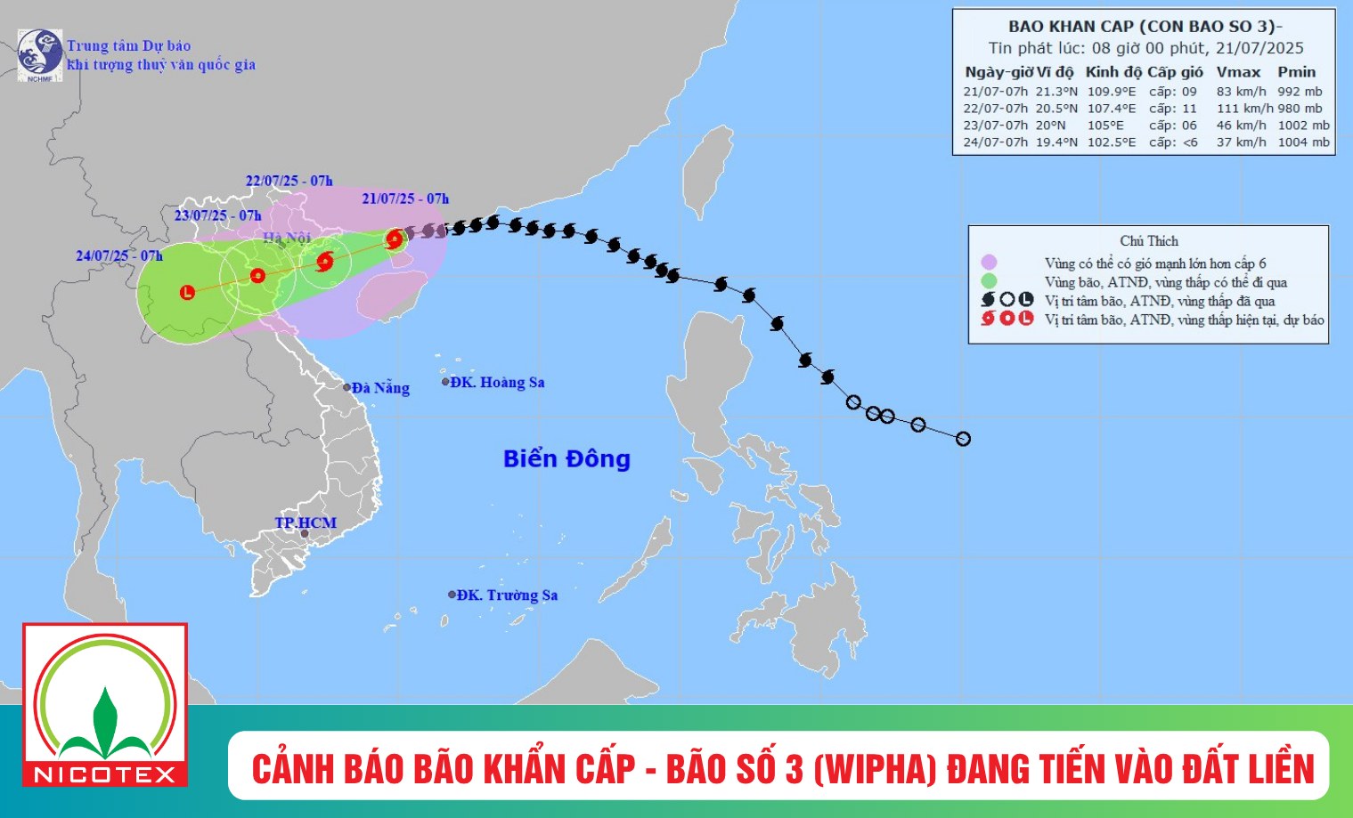 Theo thông tin mới nhất từ Trung tâm Dự báo Khí tượng Thủy văn Quốc gia, sáng nay ngày 21/7/2025, cơn bão số 3 (tên quốc tế WIPHA) đã mạnh lên, giật cấp 11 và đang di chuyển với tốc độ rất nhanh vào khu vực Vịnh Bắc Bộ. Hoàn lưu bão dự kiến gây mưa rất lớn trên diện rộng, đe dọa trực tiếp đến tính mạng và thành quả lao động của bà con nông dân.
