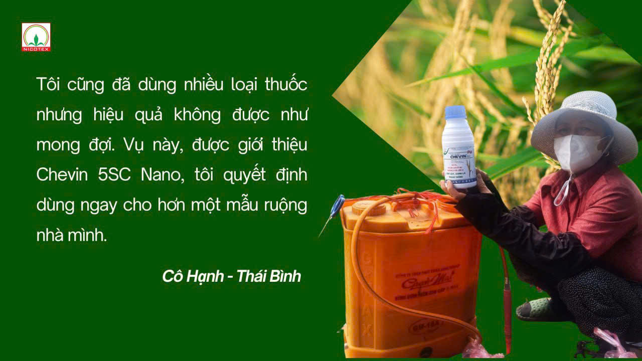 Với những ưu điểm vượt trội, Chevin 5SC Nano của công ty Nicotex đang dần khẳng định là một “khiên chắn thép” đáng tin cậy, đồng hành cùng nhà nông trong cuộc chiến bảo vệ mùa màng, hướng tới một nền nông nghiệp Việt Nam phát triển bền vững và hiệu quả.