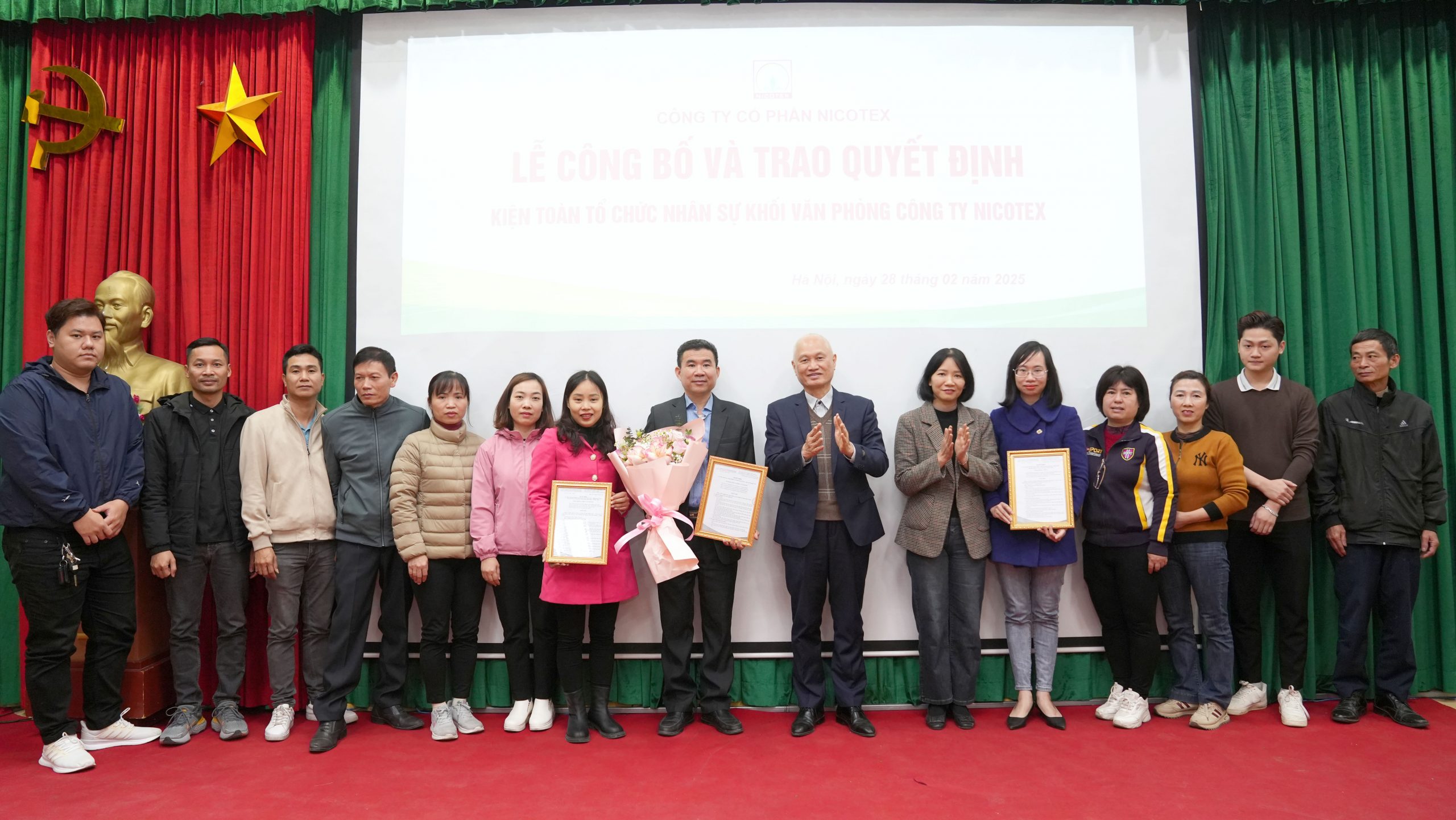 Sáng ngày 28/02/2025, công ty Nicotex tổ chức Lễ công bố và trao quyết định kiện toàn tổ chức nhân sự khối Văn phòng công ty Nicotex. Đây là một bước đi quan trọng của Hội đồng quản trị, Ban Tổng giám đốc nhằm nâng cao tính hiệu quả trong hoạt động quản lý, đồng thời đáp ứng nhanh chóng và linh hoạt, phù hợp với xu hướng phát triển chung của đất nước.