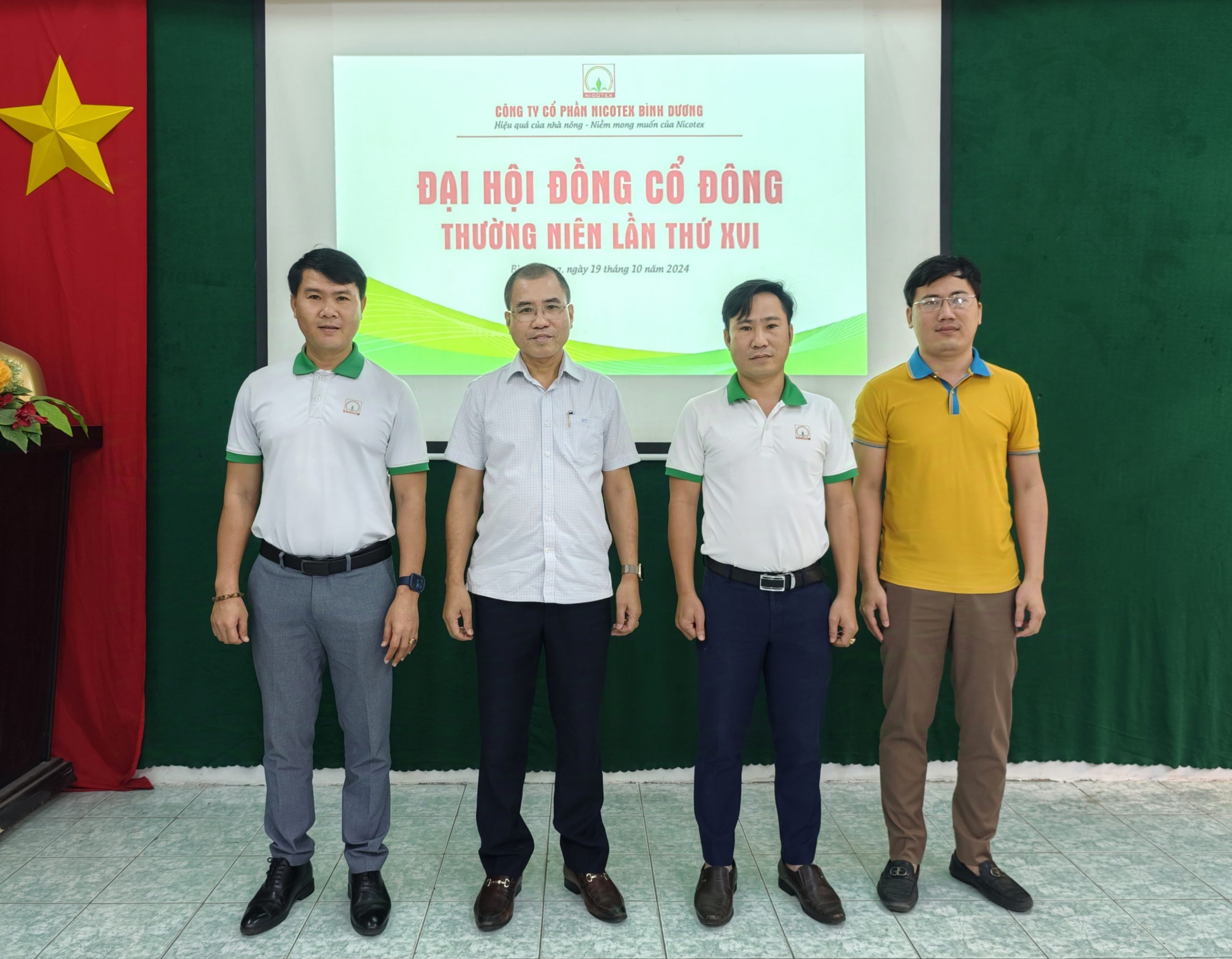Đại hội đồng cổ đông thường niên năm 2024 Công ty CP Nicotex Bình Dương kết thúc thành công tốt đẹp. Các cổ đông nhất trí cao với các bản báo cáo, phương án phân phối lợi nhuận và các chỉ tiêu kế hoạch năm 2025.