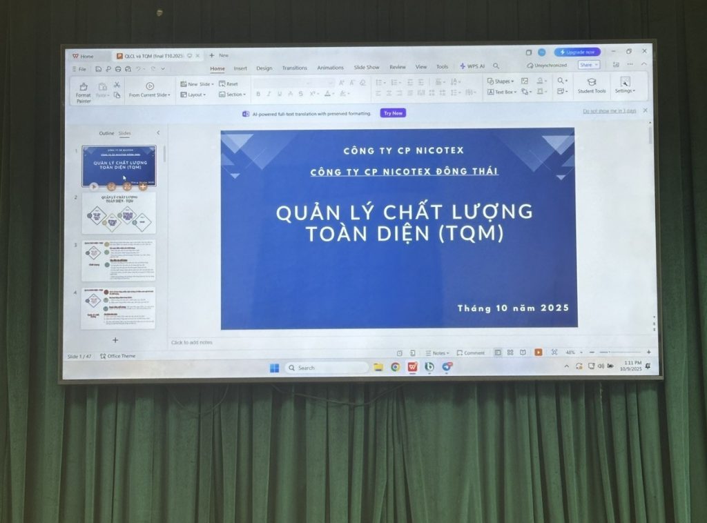 Nhằm không ngừng nâng cao chất lượng sản phẩm và hàng hóa trong quá trình sản xuất, đáp ứng tốt nhất nhu cầu của thị trường, Công ty Nicotex Đông Thái đã tổ chức chương trình huấn luyện Quản lý Chất lượng toàn diện (TQM).