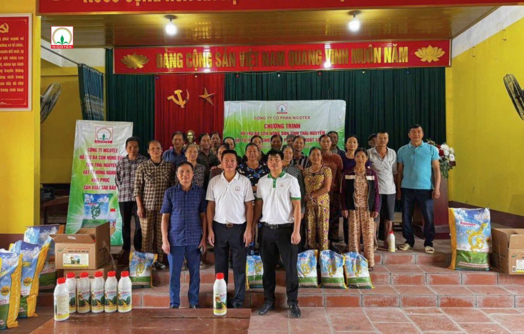 Hành trình yêu thương ấy đã chính thức bắt đầu tại 4 xã chịu thiệt hại nặng nề của tỉnh Thái Nguyên: Tân Khánh, Kha Sơn, Tân Thành và Dân Tiến. Đoàn công tác của công ty Nicotex Atatco đã trực tiếp đến từng địa phương để trao tặng gói hỗ trợ trị giá 100 triệu đồng gồm các sản phẩm nông nghiệp thiết yếu như thuốc phân Apoger 3.2GR và thuốc trừ cỏ Glufast 200SL. Với tinh thần “tương thân tương ái – cùng nhau vượt qua khó khăn”, đoàn đã tận tình thăm hỏi, động viên và trao tận tay những phần quà ý nghĩa, giúp nông dân có thêm vật tư để phục hồi sản xuất và chuẩn bị cho vụ mùa mới. Không dừng lại ở đó, ngọn lửa yêu thương tiếp tục được lan tỏa đến các tỉnh thành khác: