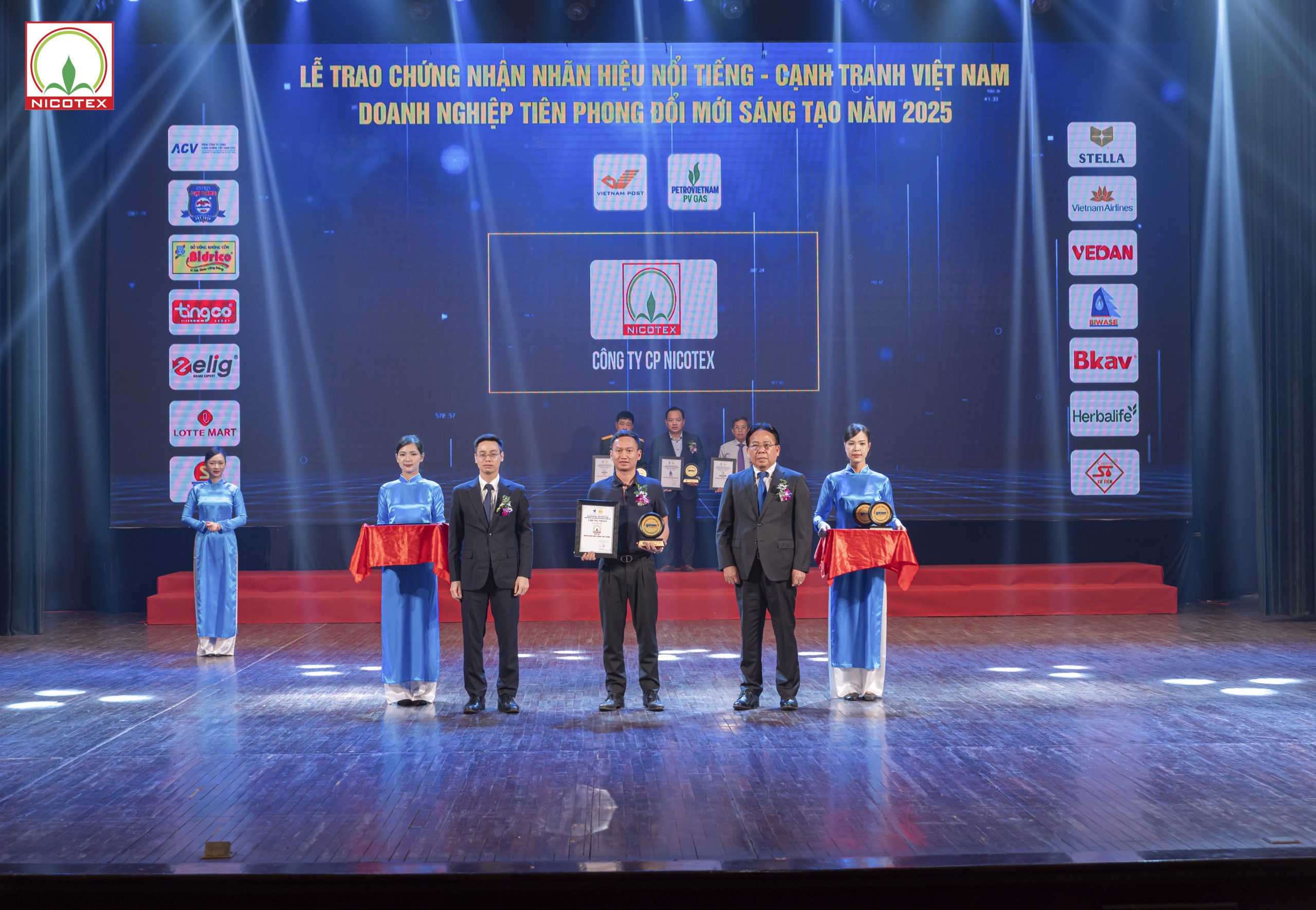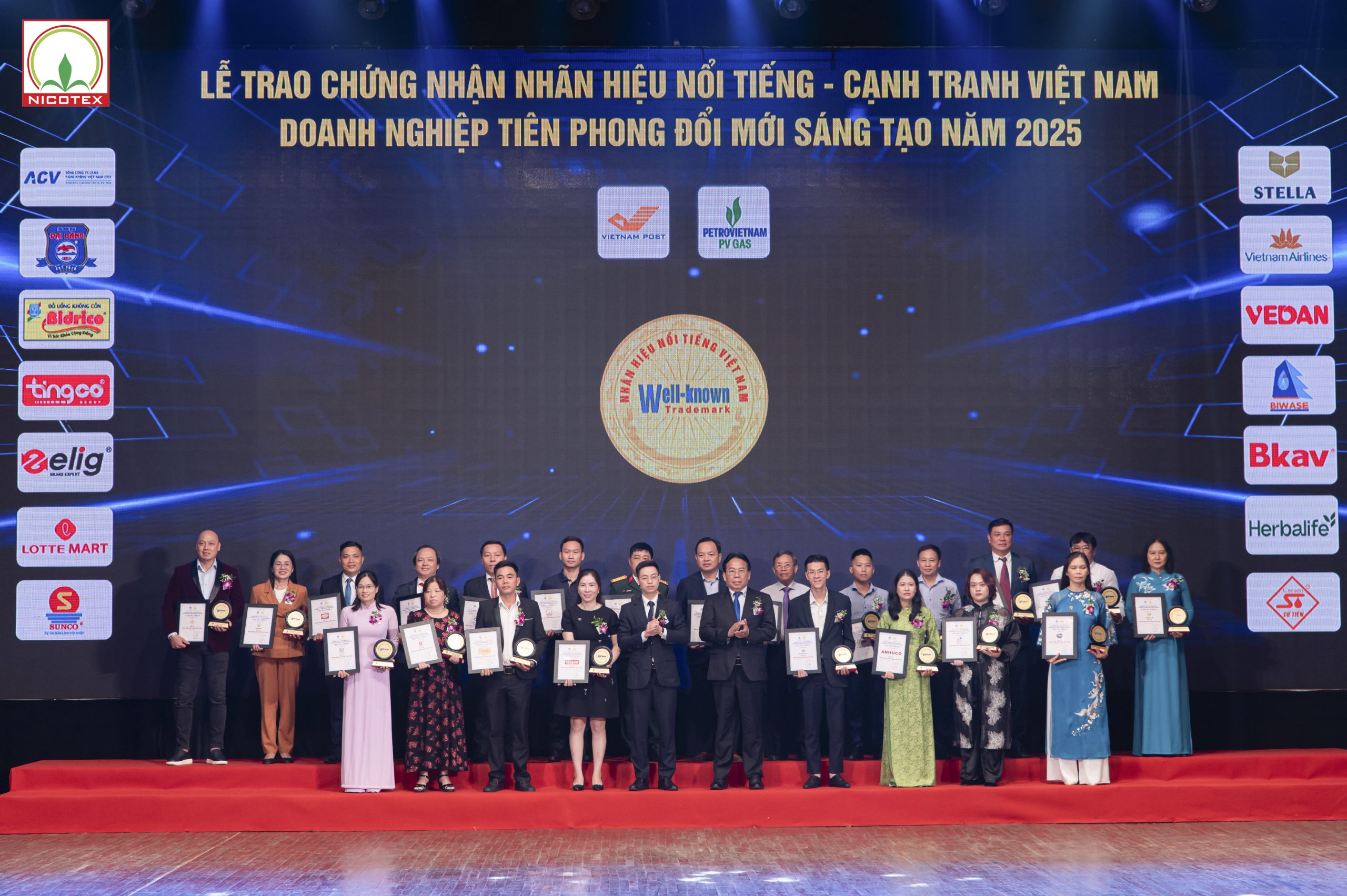 Ngày 9/8/2025, tại Thủ đô Hà Nội, trong không khí trang trọng của Lễ Công bố và Vinh danh “Nhãn hiệu nổi tiếng – Cạnh tranh Việt Nam 2025”, Công ty Cổ phần Nicotex đã vinh dự được xướng tên trong Top 50 “Nhãn hiệu nổi tiếng, nhãn hiệu cạnh tranh Việt Nam – Doanh nghiệp tiên phong đổi mới sáng tạo năm 2025. Đặc biệt, đây là lần thứ ba liên tiếp Nicotex nhận được giải thưởng danh giá này, một sự kiện ý nghĩa kép khi diễn ra đúng vào dịp công ty đang hướng tới kỷ niệm 35 năm hình thành và phát triển (1990 – 2025).