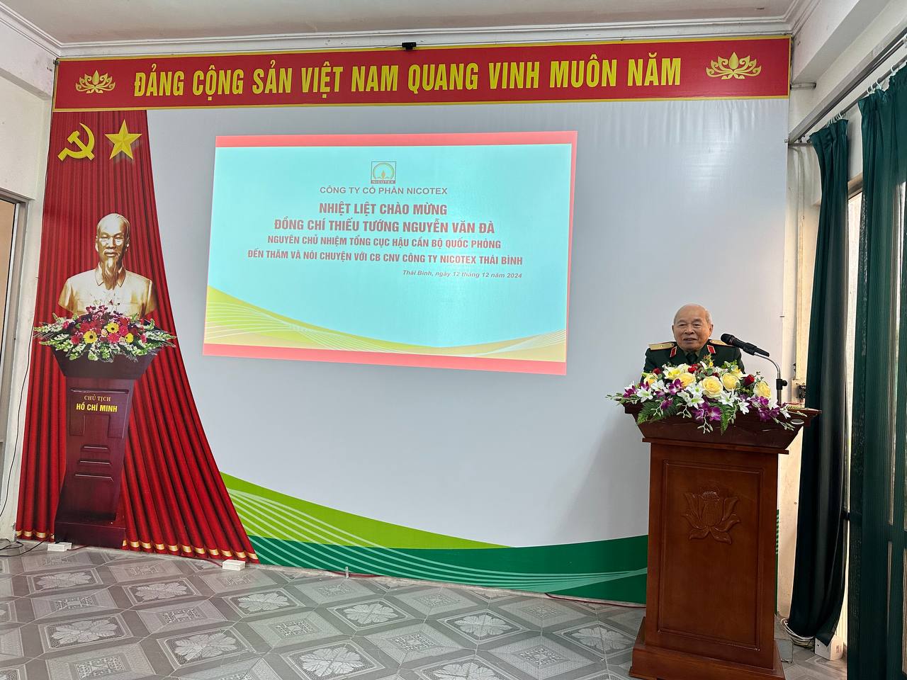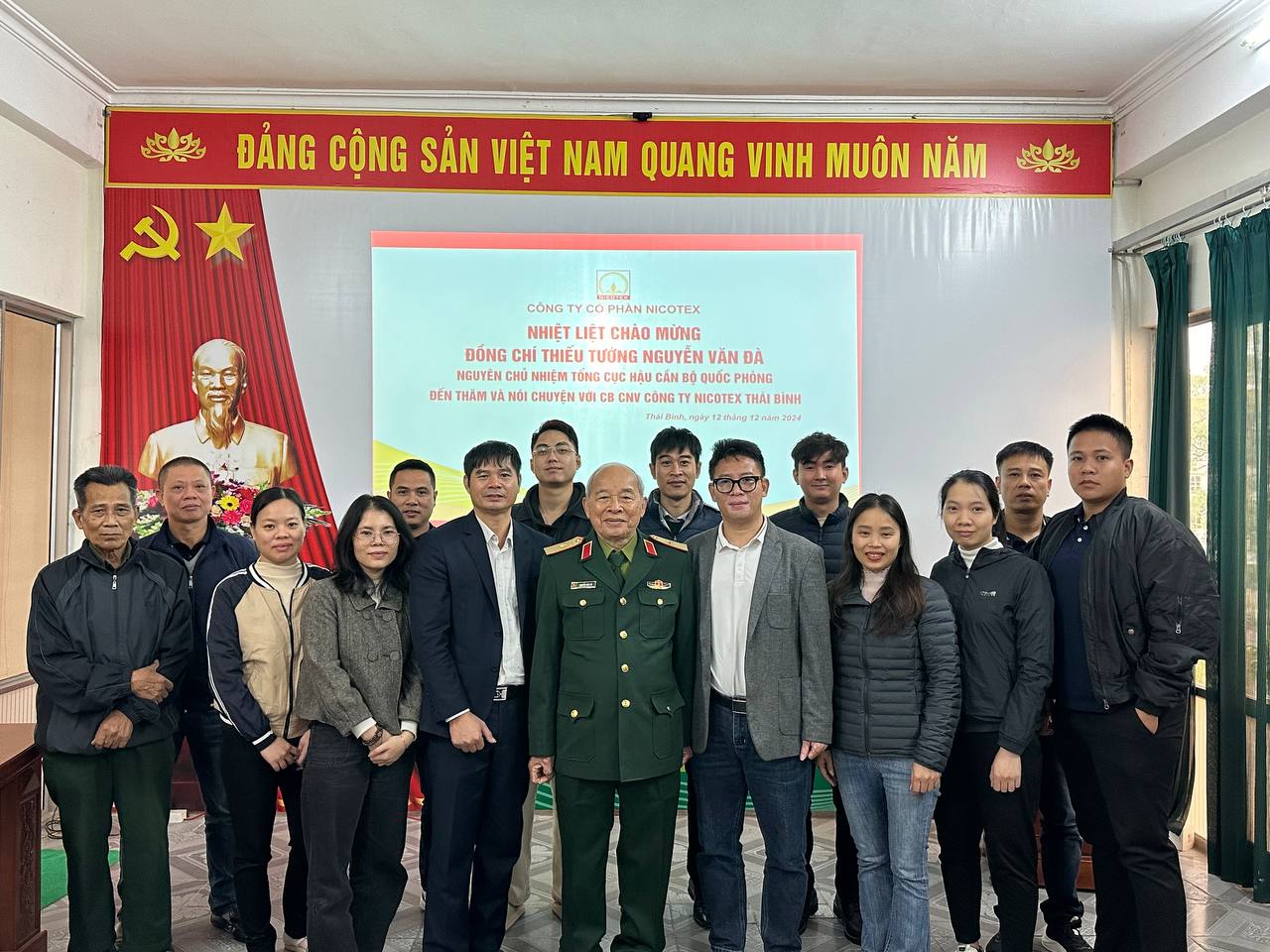 Ngày 12/12/2024, công ty Nicotex Thái Bình, Nicotex Đông Thái và xí nghiệp Tiền Hải vinh dự được đón tiếp Thủ trưởng Thiếu tướng Nguyễn Văn Đà – Nguyên chủ nhiệm Tổng cục Hậu cần – Bộ Quốc Phòng đã đến thăm và động viên cán bộ nhân viên các công ty thành viên trong hệ thống Nicotex đóng quân tại Thái Bình.