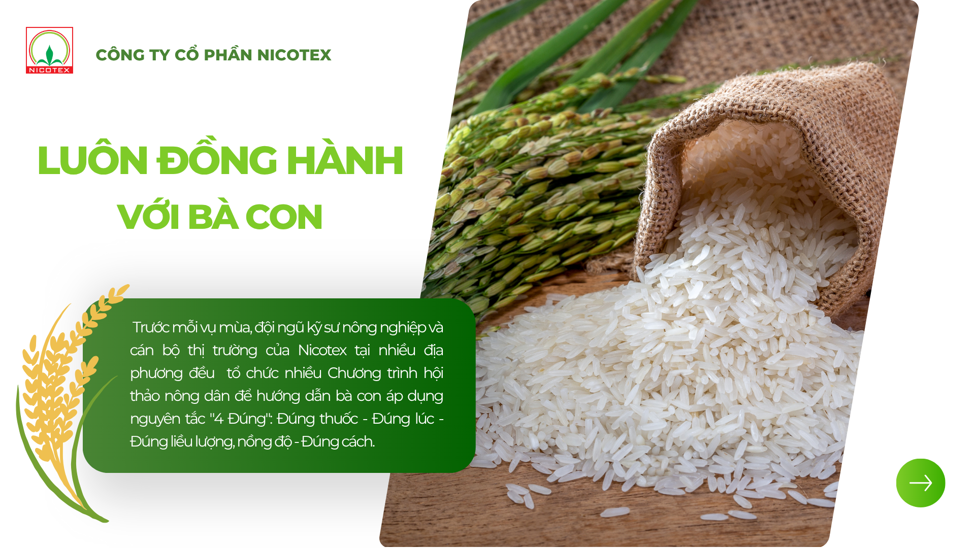 Trước mỗi vụ mùa, đội ngũ kỹ sư nông nghiệp và cán bộ thị trường của Nicotex tại nhiều địa phương đều tổ chức hàng loạt chương trình tập huấn kiến thức “Sử dụng thuốc bảo vệ thực vật (BVTV), phân bón an toàn – hiệu quả”. Thông qua các buổi hội thảo đầu bờ và hội thảo nông dân, cán bộ kỹ thuật của Nicotex thường xuyên hướng dẫn bà con áp dụng nguyên tắc “4 Đúng”: Đúng thuốc – Đúng lúc – Đúng liều lượng, nồng độ – Đúng cách.