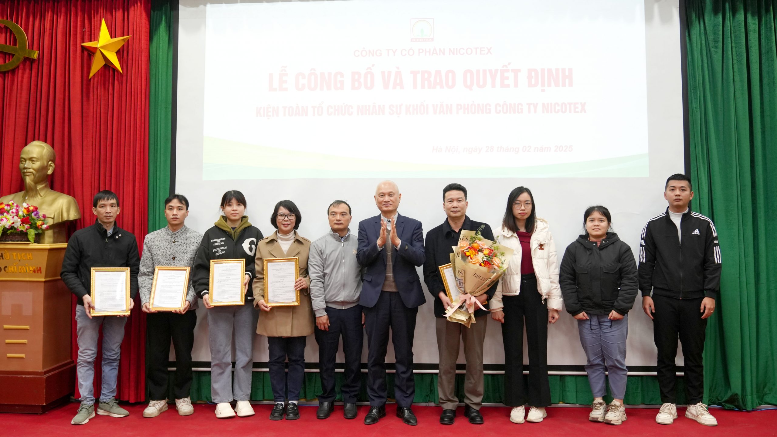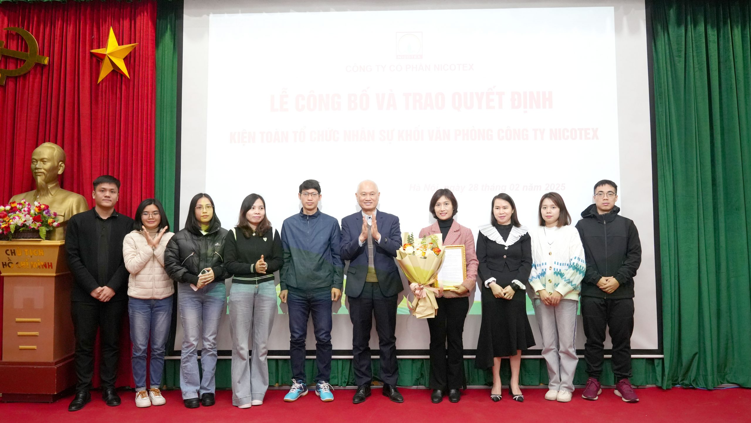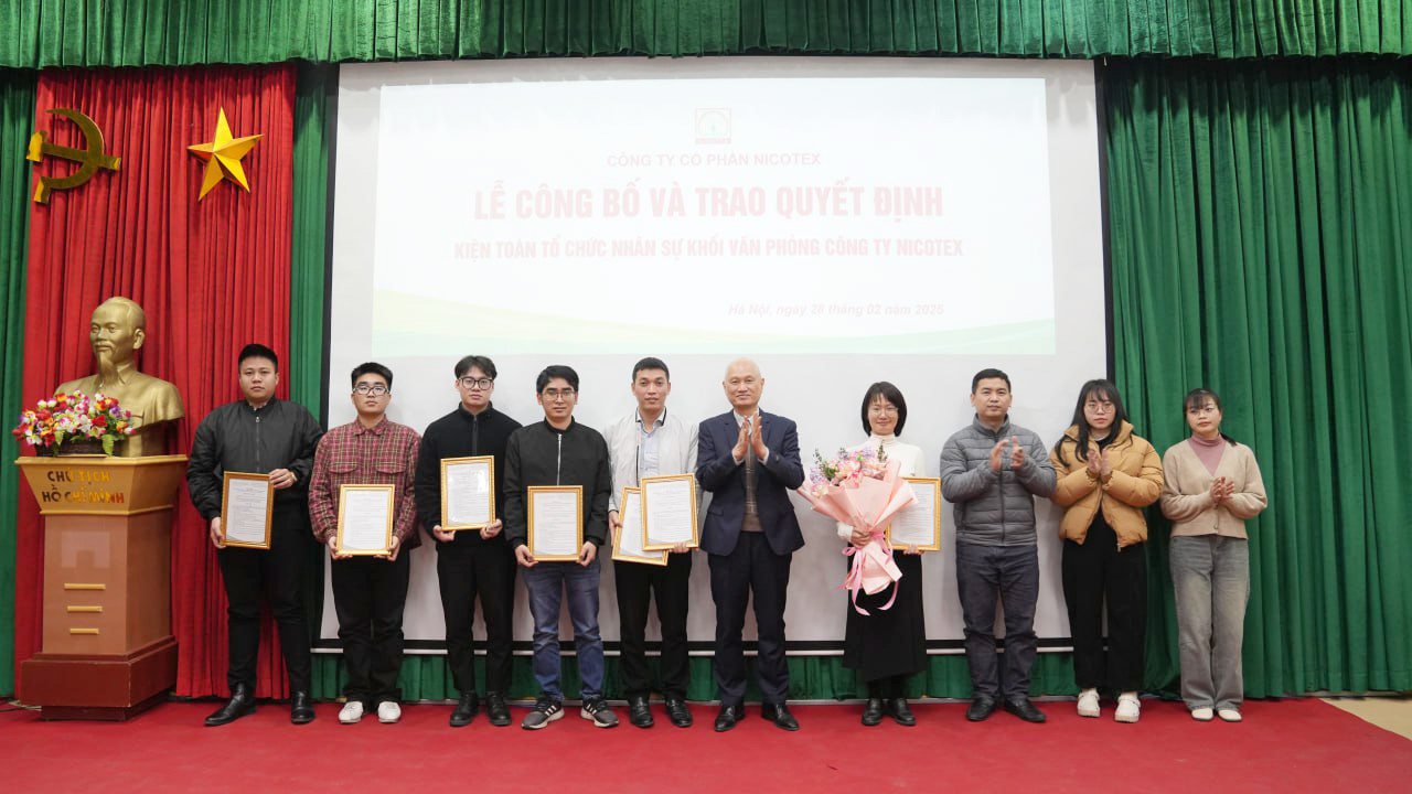 Sáng ngày 28/02/2025, công ty Nicotex tổ chức Lễ công bố và trao quyết định kiện toàn tổ chức nhân sự khối Văn phòng công ty Nicotex. Đây là một bước đi quan trọng của Hội đồng quản trị, Ban Tổng giám đốc nhằm nâng cao tính hiệu quả trong hoạt động quản lý, đồng thời đáp ứng nhanh chóng và linh hoạt, phù hợp với xu hướng phát triển chung của đất nước.